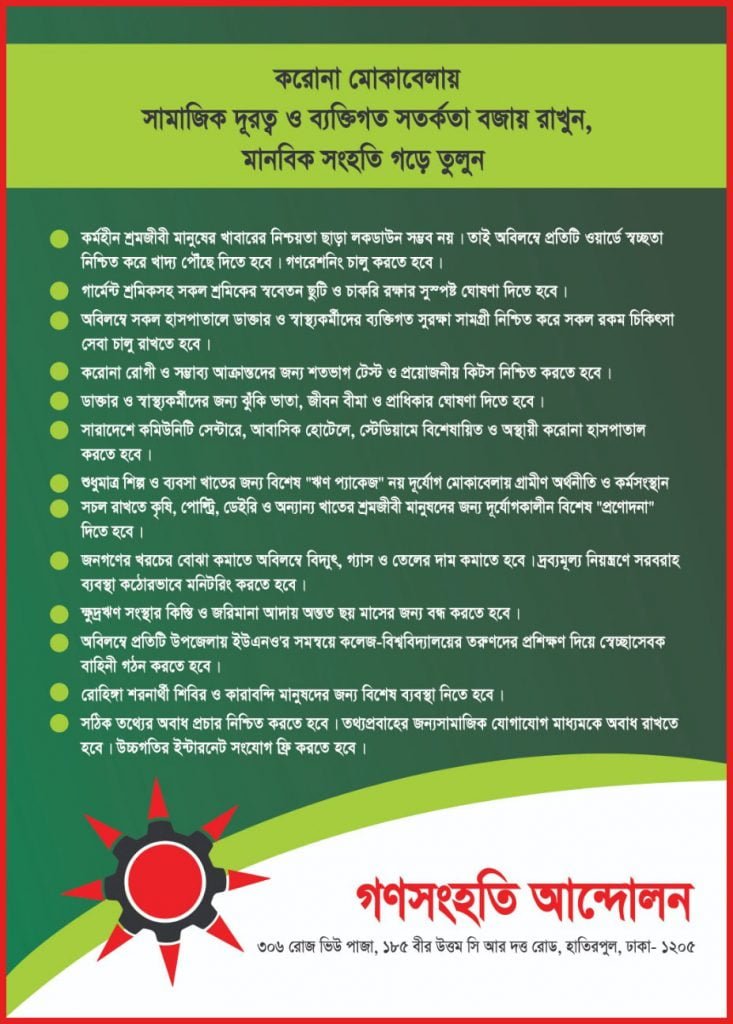 করোনা মোকাবেলায় সামাজিক দূরত্ব ও ব্যক্তিগত সতর্কতা বজায় রাখুন, মানবিক সংহতি গড়ে তুলুন Post author:Ganosamhati Andolon Post published:April 7, 2020 Post category:Leaflet Post comments:0 Comments Tags: Corona, Corona in Bangladesh, Coronavirus Read more articles Previous Postসর্বনাশা ছুটি! You Might Also Like ৭ দফা দাবিতে স্বাস্থ্যমন্ত্রনালয় অভিমুখে বিক্ষোভ ও অবস্থান June 15, 2020 Leave a Reply Cancel replyYou must be logged in to post a comment.